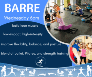 Low impact class combining the principles of ballet and other dance based movements with core engagement (Pilates) in high repetitions to improve muscle strength and endurance as well as balance.